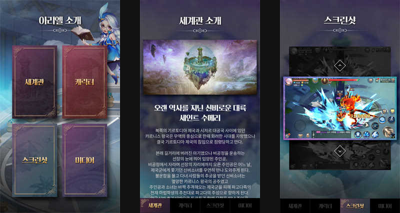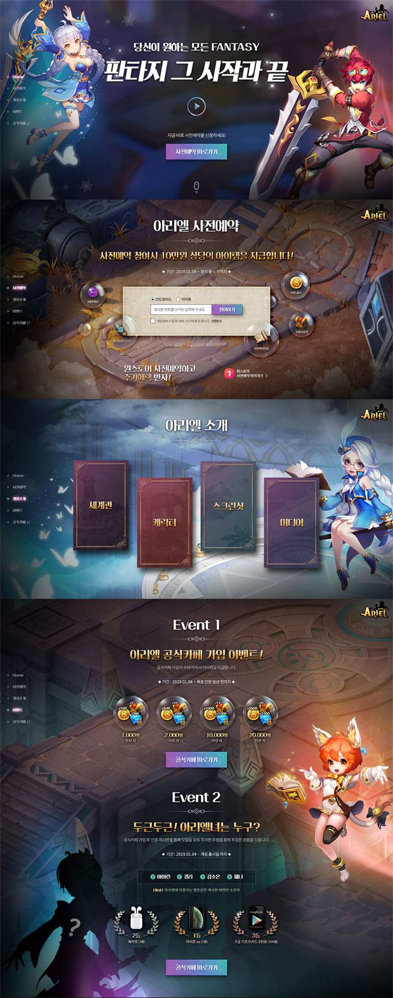 사전예약 프로모션이 모바일 게임의 성패를 좌우하는 중요한 포인트인 만큼, ARIEL 사전예약 페이지는 ARIEL 세계관 속 흥미진진한 스토리를 소개함과 동시에 다양한 이벤트 페이지를 통해 ARIEL 유저의 혜택을 직관적으로 표현함으로서 높은 사전예약률과 이벤트 참여율을 달성하도록 제작하였습니다.