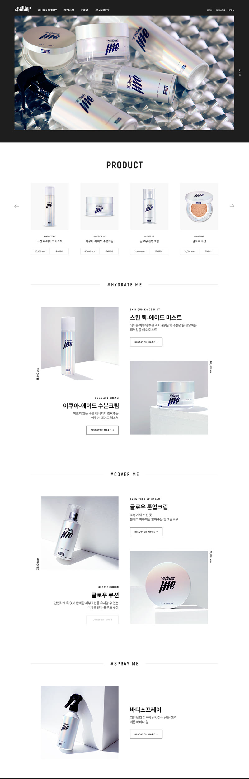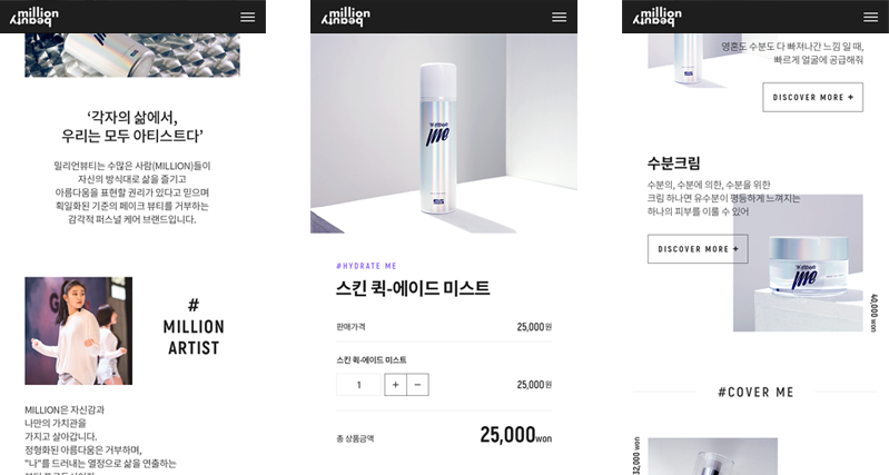 LG생활건강과 세계적인 댄스팀 '1 million'의 콜라보로 탄생한 밀리언뷰티 브랜드의 글로벌 쇼핑몰을 구축하였습니다.
