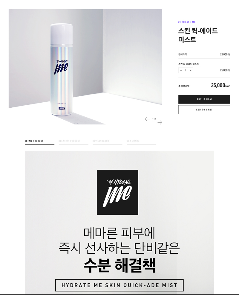 감각적인 퍼스널 케어 브랜드의 느낌을 살린 비대칭형 디자인과 생동감있는 스크립트 효과를 적용하였고, 무채색, 빅사이즈 UI 활용으로 콘텐츠와 제품이 더욱 부각될 수 있도록 제작하였습니다.