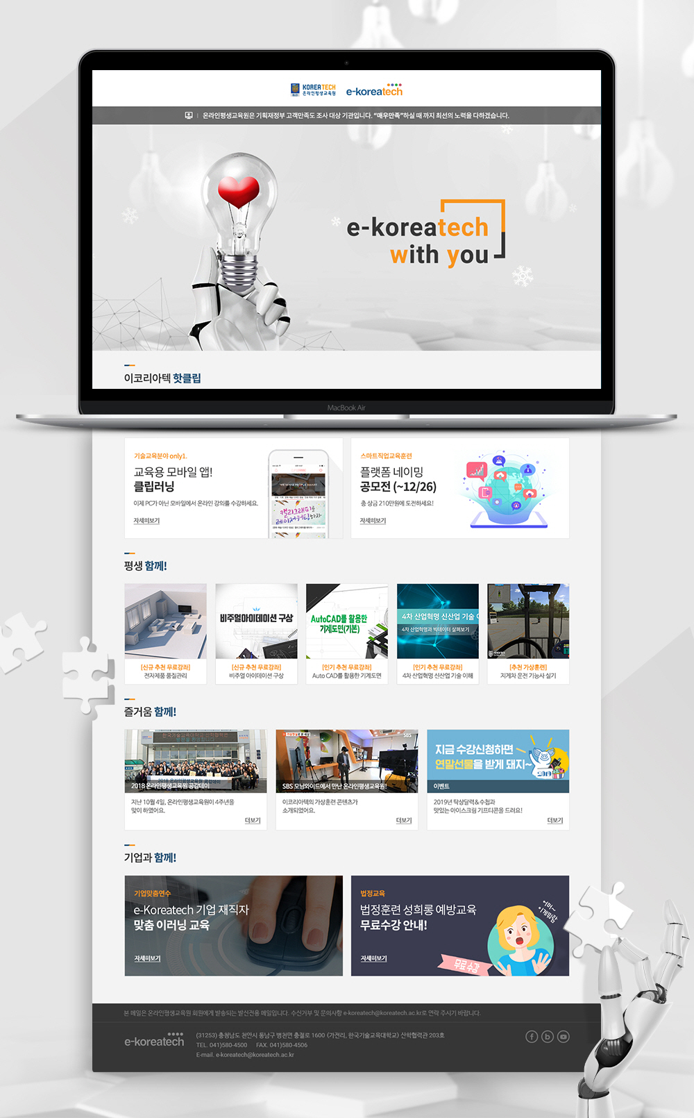 포트폴리오 All Web Mobile App Responsive maintenance 온라인평생교육원 이코리아텍 뉴스레터 Category Web Client 한국기술교육대학교 Created Dec. 2018 이전글 목록 다음글 한국기술교육대학교 온라인평생교육원 뉴스레터페이지. #뉴스레터 이전 목록 다음